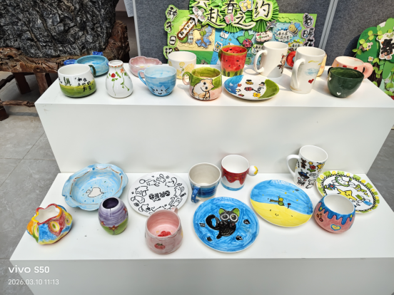 本次陶艺创作活动中,教职工们化身“陶艺匠人”,从捏塑成型到彩绘装饰,一步步将泥土塑造成形态各异的杯盏、花瓶与餐盘。作品或清新淡雅,或活泼俏皮,既有充满童趣的卡通形象,也有诗意盎然的山水花草,每一件都凝聚着创作者的巧思与巧劲,展现了教职工们在工作之外的艺术才情与生活热情。