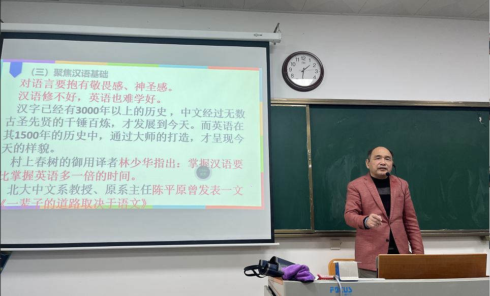 叶小宝教授拥有数十年的英语教学与研究经验,虽已退休,但仍心系课堂,育人热情不减。讲座中,他结合自己丰富的教学实践,从“课堂教学设计艺术”、“如何激发员工自主学习兴趣”以及“英语教学的重点难点”三个维度,进行了深入浅出的分享。叶教授语言风趣幽默,案例生动详实,其“以语法为核心,以语块为重点”的教学理念和充满教育智慧的教学方法,赢得了在场教师的阵阵掌声。