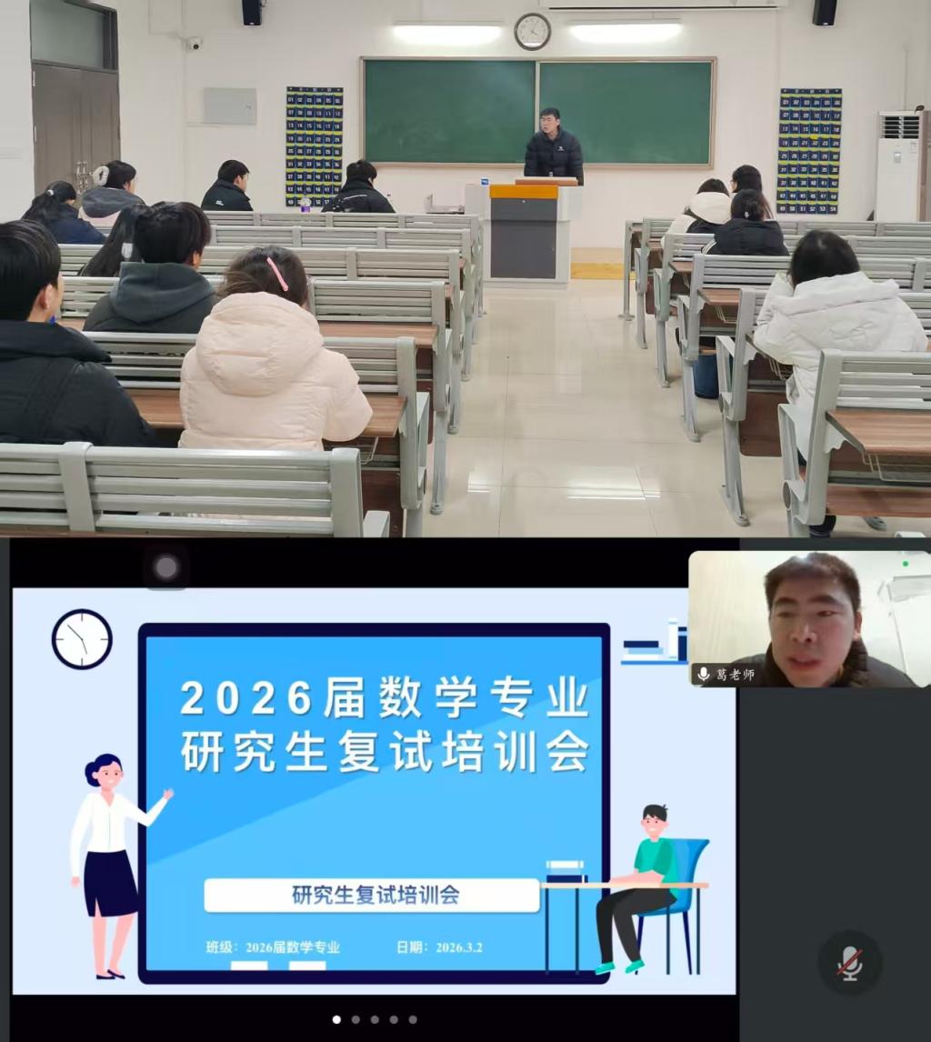 近日,数学与应用数学教研室为2026届考研学子组织开展线上线下相结合的复试专项指导,本次指导由葛康康老师围绕复试笔试、面试技巧、分数分层规划及调剂策略四大方面进行系统讲解。