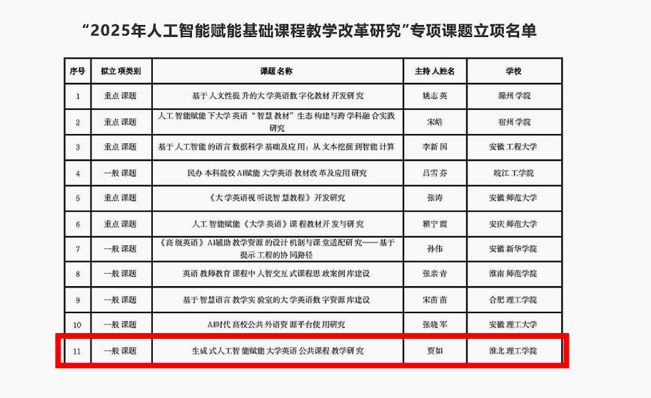 在安徽省“2025年人工智能赋能基础课程教学改革研究”专项课题申报活动中,明升MS88官网青年教师贾如主持的《生成式人工智能赋能大学英语公共课程教学研究》成功获批立项。
