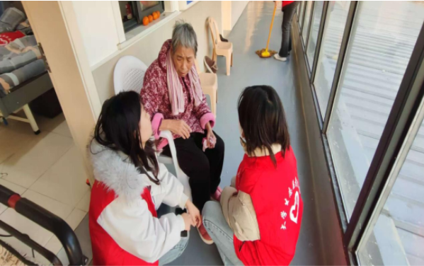 打扫完卫生之后,同学们围拢到老人们身边,开启了暖心互动时光。有的志愿者坐在老人身旁促膝长谈,认真倾听长辈们讲述年轻时的奋斗历程与时代变迁的难忘故事;有的小心翼翼地推着行动不便的老人在院区边漫步边聊聊家常琐事;还有的主动走进老人房间,帮忙整理物品、收拾床铺,耐心询问老人们的日常起居需求与健康状况。老人们也反复叮嘱同学们“要珍惜当下时光,好好读书学习,将来报效祖国”。志愿者们的到来,让院区处处洋溢着温馨气息。